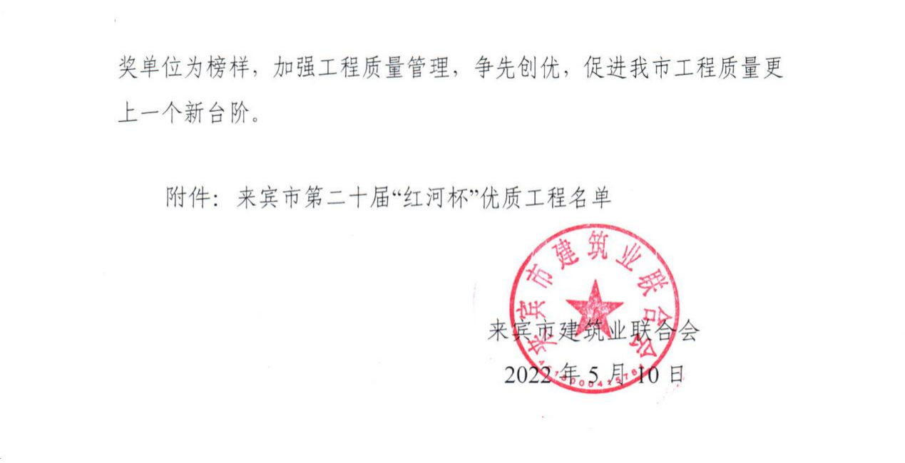 5月10日,来宾市建筑业联合会印发《关于公布来宾市第二十届“红河杯”优质工程名单的通知》,开云集团有限公司承建的来宾市烈士陵园项目、裕达•裕嘉园5#楼(不含地下室)、裕达•翡翠园3#楼(不含地下室)等共8个项目荣获来宾市第二十届“红河杯”优质工程奖。