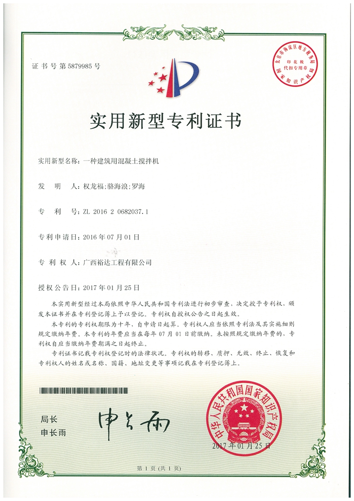 2017年实用新型专利证书(一种建筑用混凝土搅拌机)