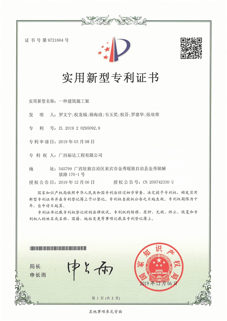2019年实用新型专利证书(一种建筑施工架)1