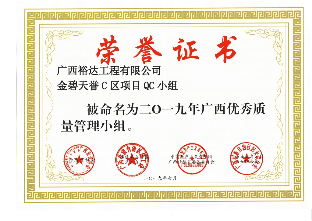 开云集团有限公司金碧天誉C区项目QC小组被命为2019年广西优秀质量管理小组